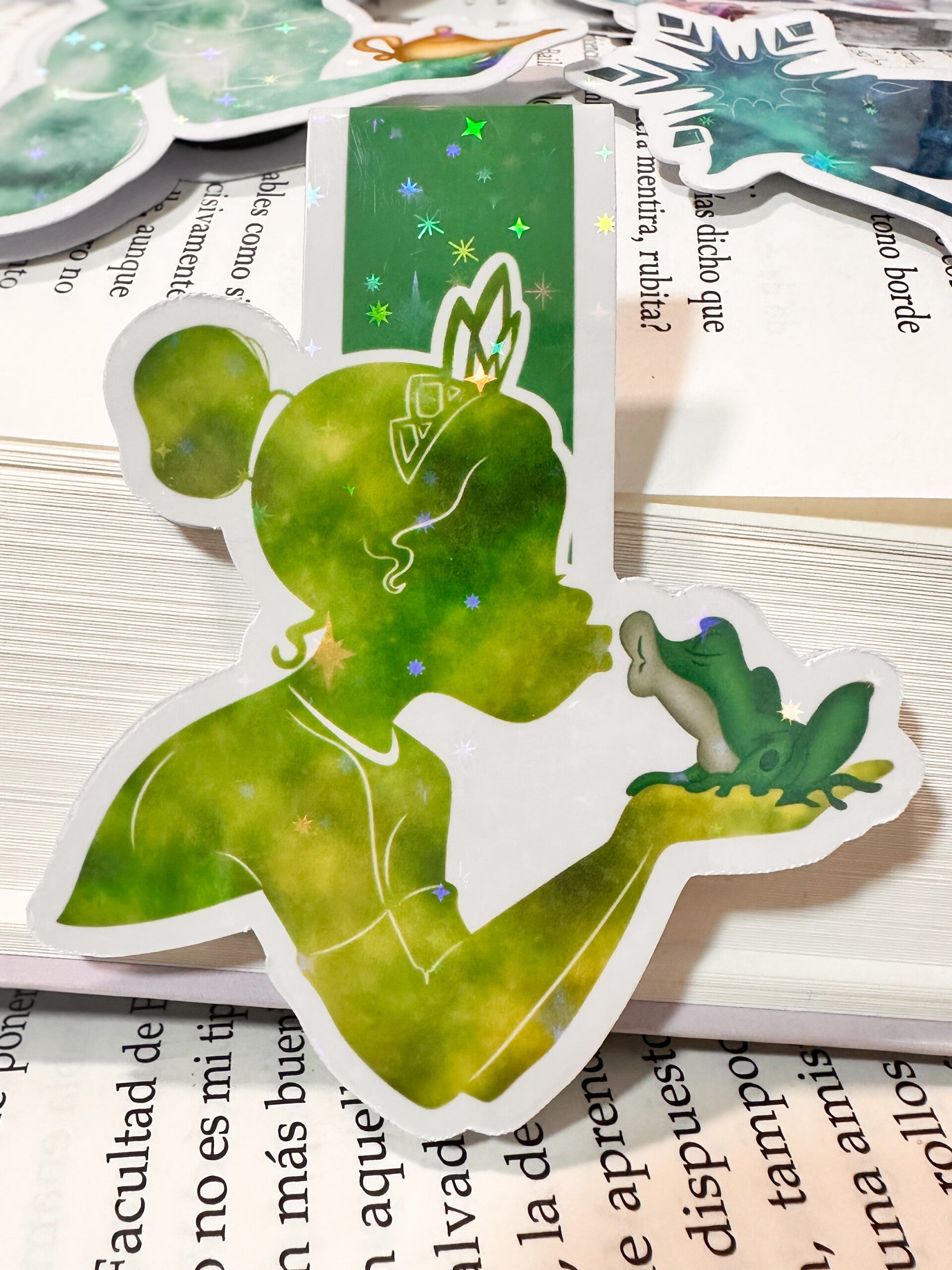 Deja que el encanto de los cuentos modernos te acompañe con este marcapáginas magnético inspirado en una valiente princesa y su inesperado príncipe. Su silueta, en tonos verdes con efecto galaxia y destellos holográficos, brilla como un sueño hecho realidad, invitándote a creer en la magia… y en los finales felices.