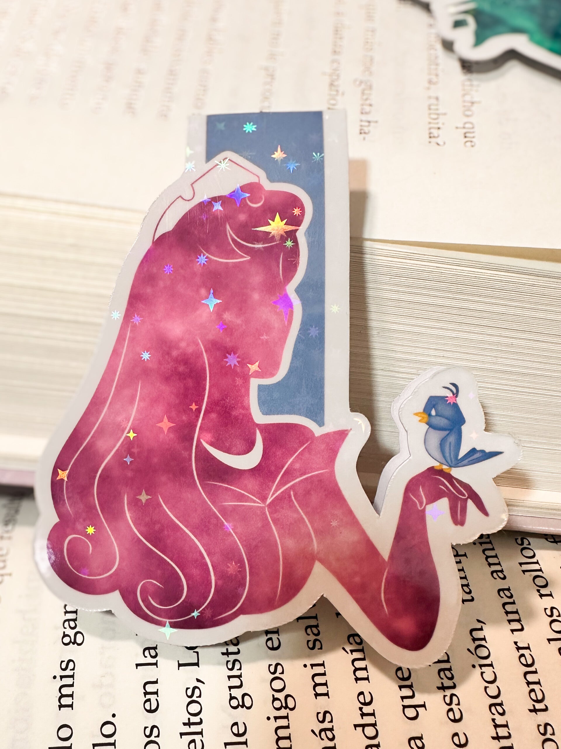 Deja que la dulzura y la magia de los bosques te envuelvan con este marcapáginas magnético inspirado en una princesa soñadora y su pequeño amigo. Su silueta, en delicados tonos rosados con efecto galaxia y destellos holográficos, brilla como un amanecer mágico, invitándote a perderte en historias llenas de encanto.
